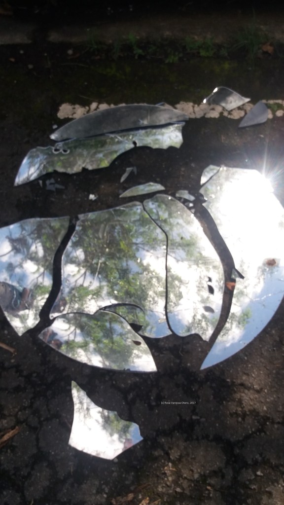 A tres meses de haber pasado el huracán María por Puerto Rico (2017), este espejo roto no había sido removido de una de las calles del Jardín Botánico de Río Piedras, donde ubican las oficinas centrales de la Universidad de Puerto Rico. Celebro su rareza, pero no la metáfora del abandono. Me perturba la exactitud con que las piezas siguen sobre el suelo, como si el tiempo se hubiera detenido (no tanto sobre las cosas como sobre las personas). Puerto Rico, ¿se levanta?