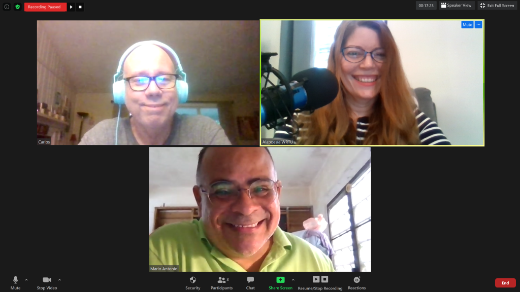 La pandemia me permitió identificar la necesidad de un «Plan B». En el 2020 tuve que aprender a la fuerza a grabar de manera virtual, e incluso a editar audio, y la coordinación de las colaboraciones se complicó. Esos podcasts pasarán a la historia como los episodios más experimentales…, imperfectos en lo técnico, pero hermosos de contenido, porque se les nota el cariño que les pusimos (mis poetas, la emisora y yo) por no detener el proyecto durante el aislamiento. Hubo que repetir episodios, pero también produjimos muchos estrenos. Así llegaron poetas jóvenes que no conocía. Terminaba extenuada, pero éticamente el planteamiento fue que no era legítimo abandonar a la audiencia porque las cosas anduvieran mal, sino todo lo contrario, debíamos resistir y acompañar. En esa temporada, tuve las colaboraciones ocasionales de Richard Rivera Cardona y las reseñas de Marioantonio Rosa.