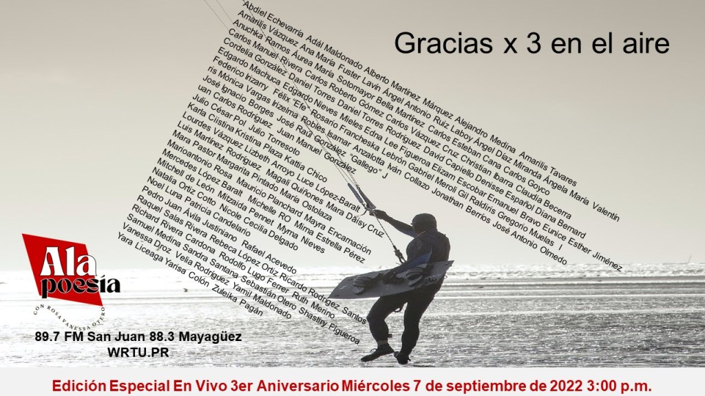 El miércoles 7 de septiembre de 2022, a las 3:00 p.m. (Zona -4 La Paz) Alapoesía celebrará su tercer aniversario con una transmisión en vivo por el 89.7 y 88.3 FM con streaming desde radiouniversidad.pr. Aquí la entrevista.