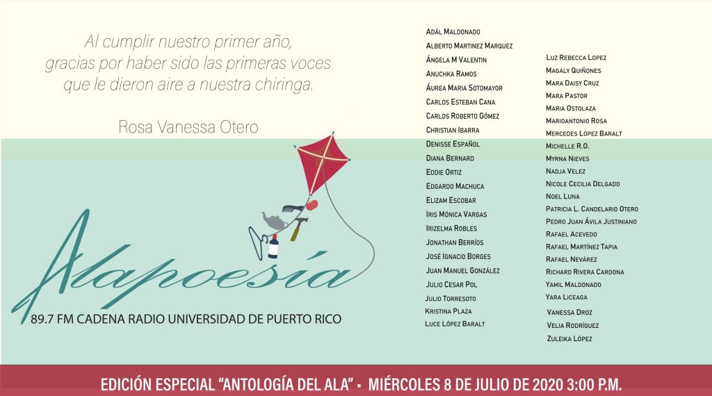 Ya son tres años de transmisión ininterrumpida de Alapoesía en Cadena Radio Universidad de Puerto Rico, una aventura inesperada en el momento en el que se cuajó (el verano de 2019), pero con la cual su fundadora, la poeta y editora Rosa Vanessa Otero había soñado varias veces, bajo distintos nombres y formatos sin que se diera la oportunidad.