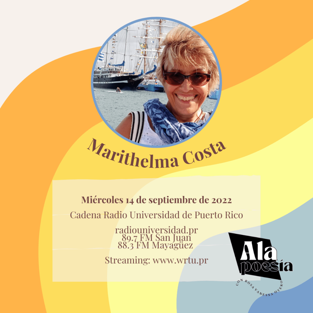 El segundo vuelo de la nueva temporada de Alapoesía, «Marithelma Costa: una viajera en su jardín», estrena el miércoles 14 de septiembre de 2022 a las 3:00 p.m. (Zona -4 La Paz). Sintonízanos desde el 89.7 u 88.3 FM o streaming por las plataformas de www.radiouniversidad.pr .