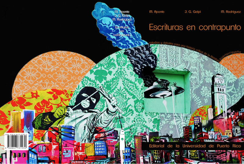 Cubierta de Escrituras en contrapunto. La ilustración es una foto de Ricardo Alcaraz para el periódico Diálogo, sobre un mural en Río Riedras por David Zayas, Rubén «Sheto» Luciano y Taller Arte Joven para líderes.
