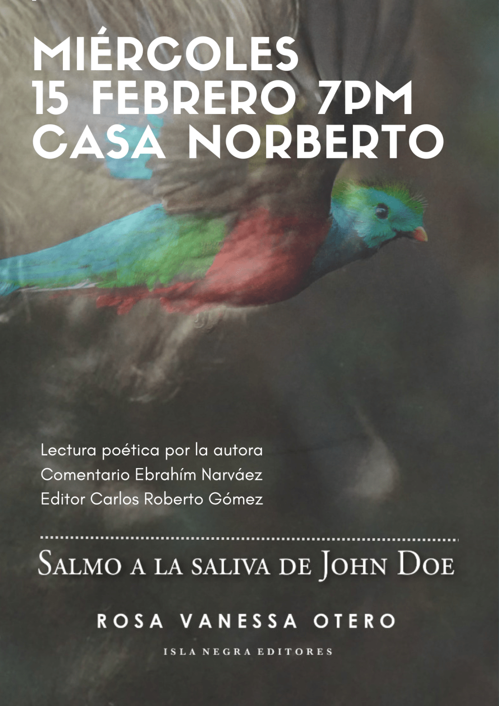 El 15 de febrero nos espera una lectura poética de Salmo a la Saliva de John Doe por la autora con comentarios por Ebrahím Narváez, poeta y editor, Premio José Gautier Benítez 2021 y la moderación de Carlos Roberto Gómez, efitor y fundador de Editorial Isla Negra. Sobre el poemario, escribe la Dra. Carmen Rivera Villegas, Catedrática en la Universidad e Puerto Rico en Mayagüez: