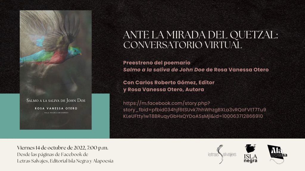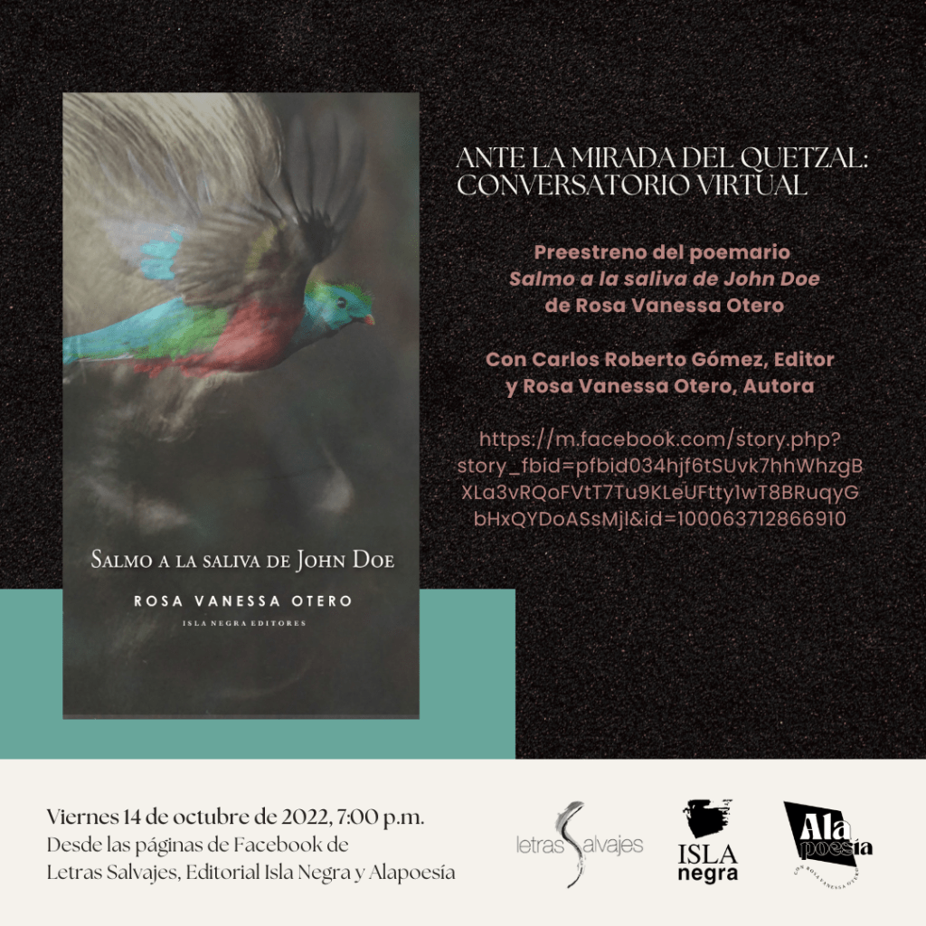 Tal como lo anunciamos en la edición radial de esta semana, hoy viernes 14 de octubre a las 7:00 p..m, te esperamos en el conversatorio virtual con motivo de la publicación del poemario Samo a la saliva de John Doe de la productora de Alapoesía, Rosa Vanessa Otero. La participación es totalmente gratuita y no requiere registro.