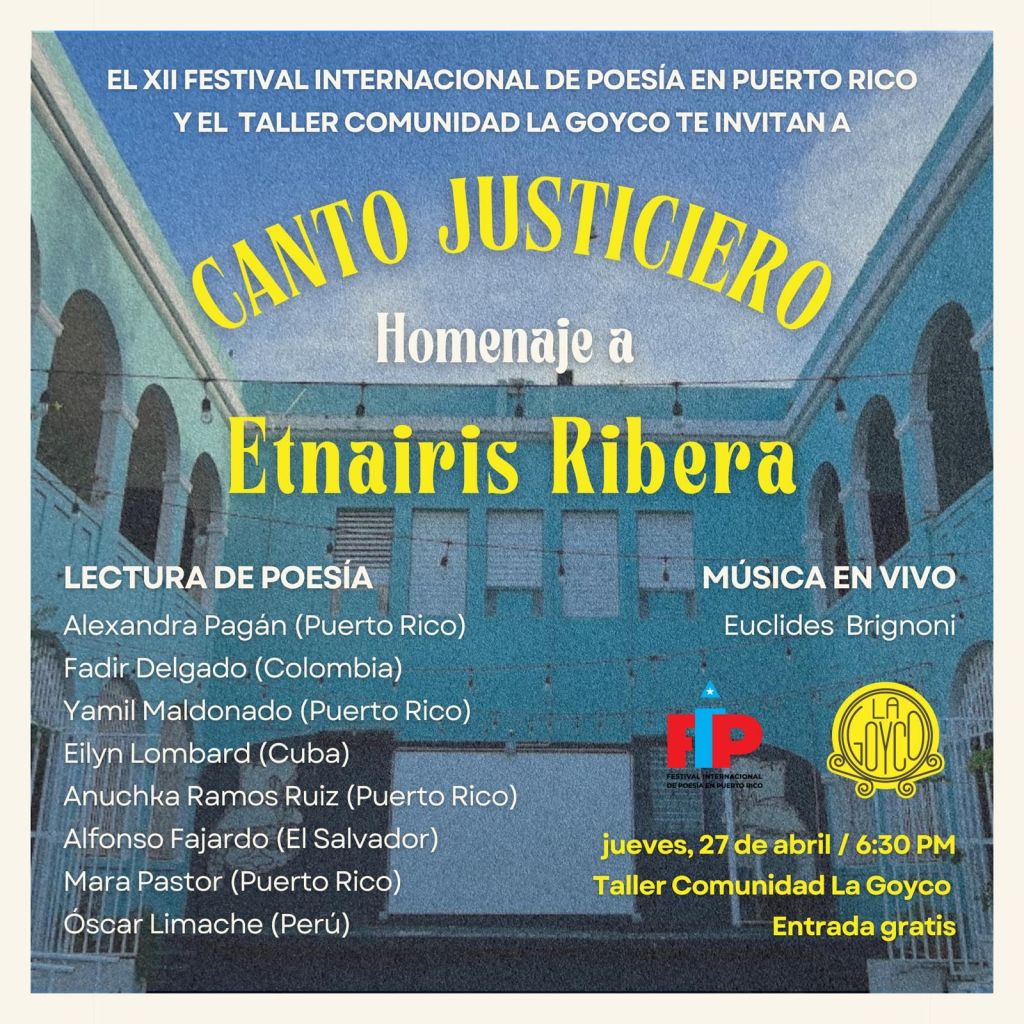 Nuestra lectura del miércoles 26 de abril es un saludo al Homenaje a Etnariris Ribera en el que un grupo de ocho poetas puertorriqueños e internacionales convocados por el FIPPR compartirán lecturas el jueves 27 de abril de 2023 a las 6: 30 p.m. en el Taller Comunidad La Goyco, ubicado en la calle Loíza de Santurce. Música por Euclides Brignoni. La entrada es gratuita. Más información en FIPPR