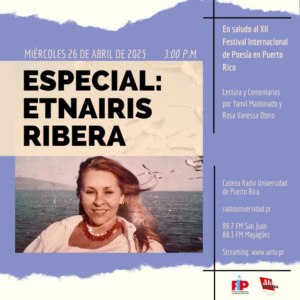 El XII Festival Internacional de Poesía en Puerto Rico dedica sus actos de 2023 a Etnairis Ribera y Alapoesía lo celebra con una lectura en las voces de Yamil Maldonado y Rosa Vanessa Otero complementada por audios de la autora seleccionados entre sus múltiples intervenciones poéticas fuera de Puerto Rico.