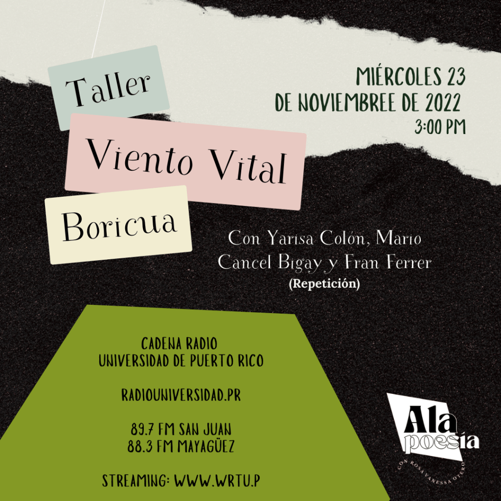 Nos acompañó en la lectura de textos la dramaturga y catedrática jubilada de la Universidad de Puerto Rico en Humacao, Carmen Zeta, cuyo libro híbrido de cuentos y poemas, titulado Amalgama tropical está en edición bajo Areté Boricua. Para disfrutar del episodio, atentos a las actualizaciones en las plataformas de podcasts de Cadena Radio Universidad de Puerto Rico en wrtu.pr